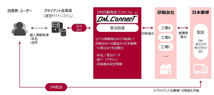 「DM Connect」 は、各種システムと連携して宛名データを取り入れることによって、DMの印刷から宛名印字、郵便局差出までを自動化するプラットフォームです。オンデマンド印刷により1枚から注文可能なほか、二次元コードなどのバリアブル印刷にも対応しており、また、DMの仕様や内容に応じて、最適な印刷会社を複数から選択することで、品質や納期、価格を最適化します。
